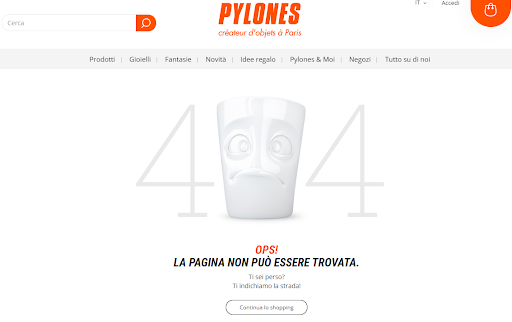 Nel caso del sito "Pylones", la pagina di errore personalizzata visualizza un disegno della propria azienda. In più, il sito offre la possibilità di tornare alla home page per continuare gli acquisti.